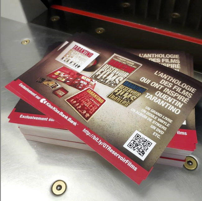 Flyers recto-simple, format A6, imprimés en 1 heure pour la promotion du projet de financement participatif « Anthologie Reservoir Film » lors d’une soirée cinéma au Max Linder.